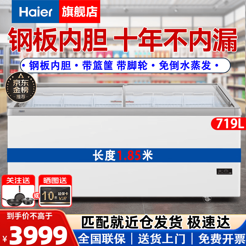 海尔(Haier)商用卧式大容量展示柜冰柜冷冻商超组合岛柜玻璃门雪糕柜弧形门海鲜冻品 平面玻璃冷藏冷冻转换1.8米719升 一级能效