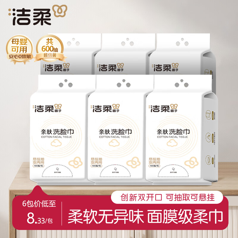 洁柔一次性洗脸巾悬挂式抽取加大加厚母婴擦脸巾干湿两用洁面巾 100抽*6包【母婴适用】