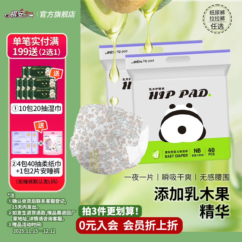 祺安T2熊猫乳木果油宝宝护臀系列柔润透气纸尿裤拉拉裤男女通用尿不湿 2包发货纸尿裤NB码共80片【更优惠】
