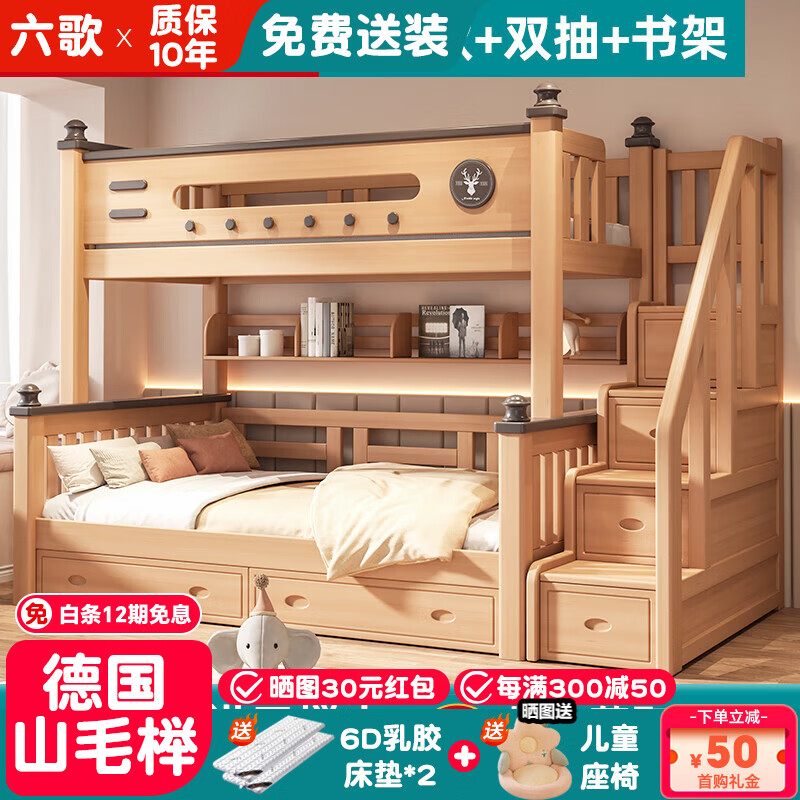 六歌德国山毛榉全实木上下铺双层子母成年大人两层床儿童多功能高低床 双梯款+书架+双抽+6D乳棕床垫*2 上铺宽150*下铺宽180