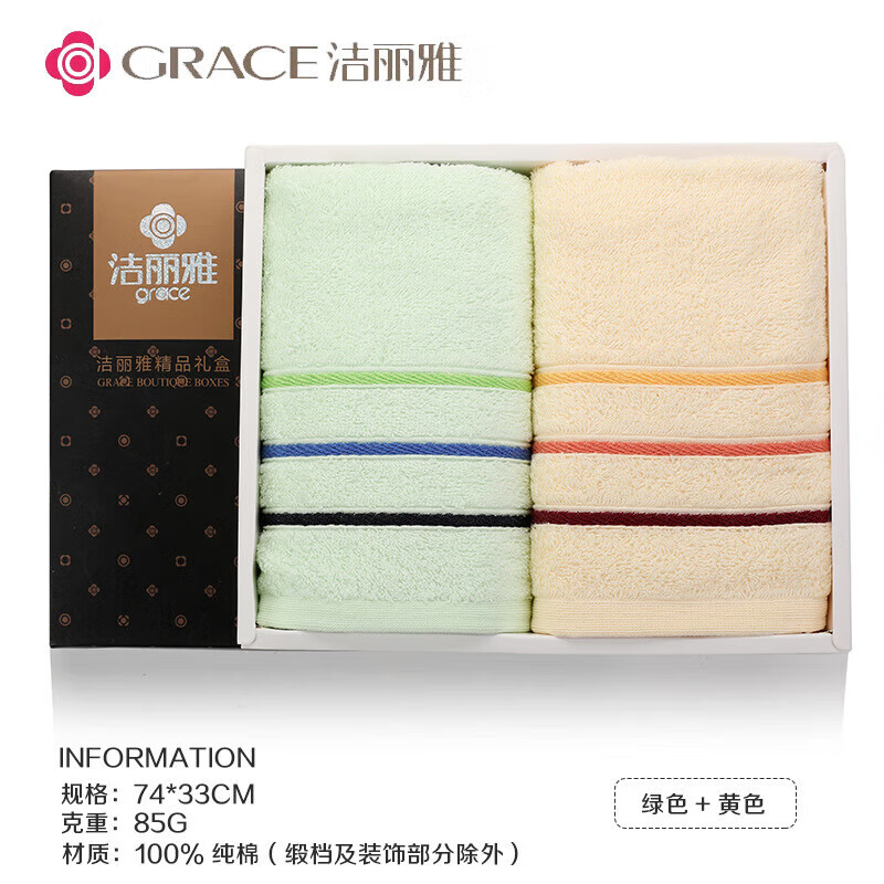 洁丽雅(Grace)毛巾礼盒2条装纯棉全棉毛巾婚庆回礼商务公司团购生日伴手礼批发 6443绿+黄商务礼盒+手提袋 全棉