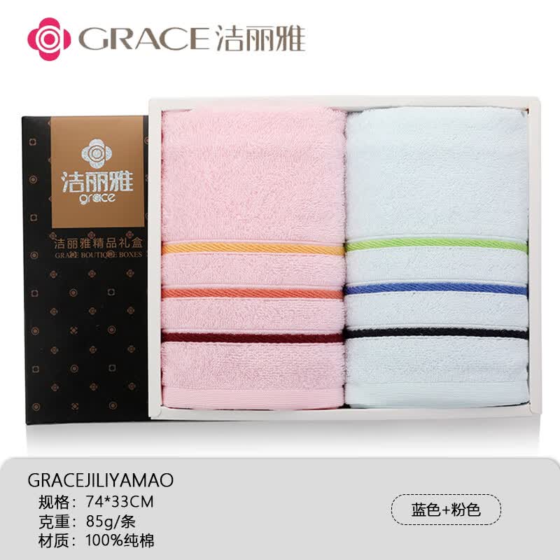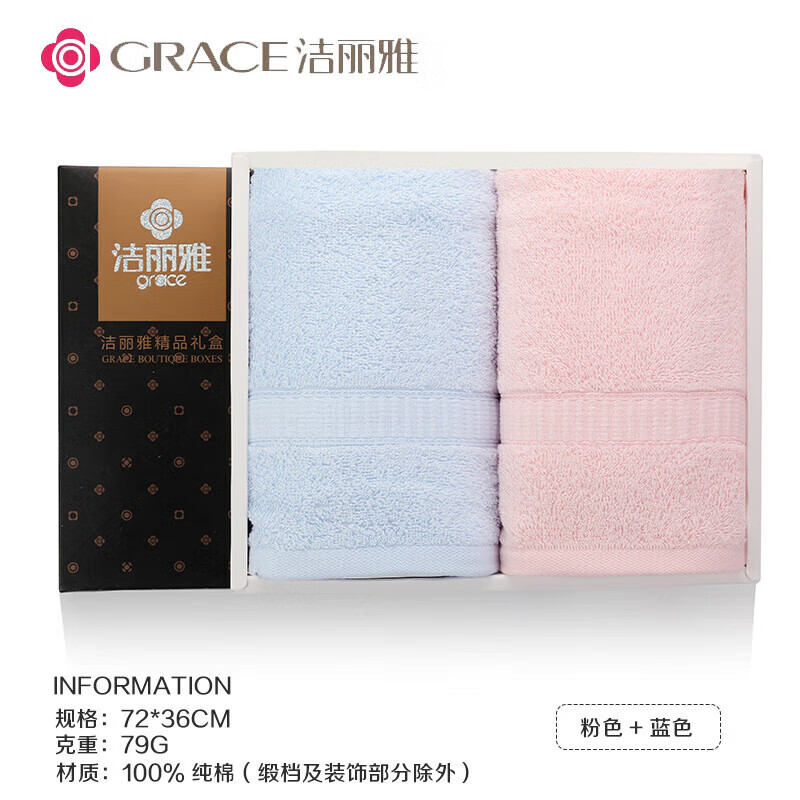 洁丽雅(Grace)毛巾礼盒2条装纯棉全棉毛巾婚庆回礼商务公司团购生日伴手礼批发 6443粉+兰商务礼盒+手提袋 全棉