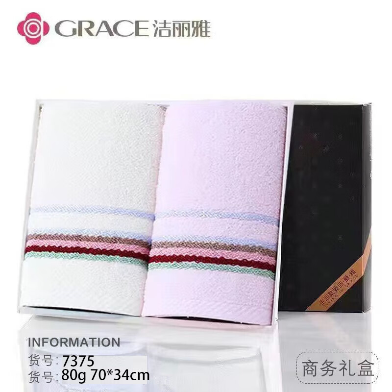 洁丽雅(Grace)毛巾礼盒2条装纯棉全棉毛巾婚庆回礼商务公司团购生日伴手礼批发 6717米+粉商务礼盒+手提袋 全棉