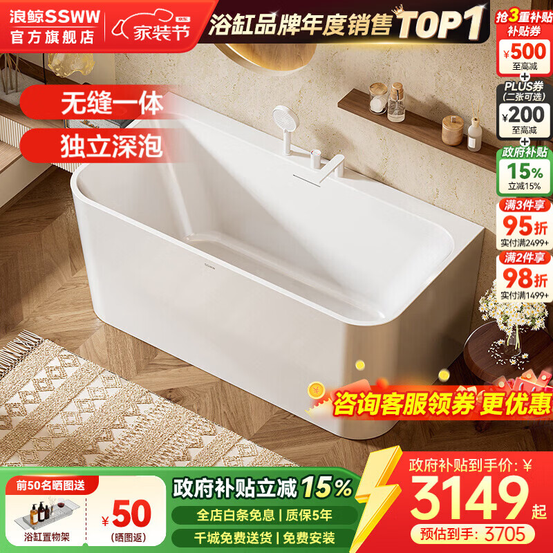 浪鲸(SSWW) 卫浴家用成人亚克力方形浴缸无缝一体泡澡浴缸含下水器0220鲸沐 【1.4m配件缸】