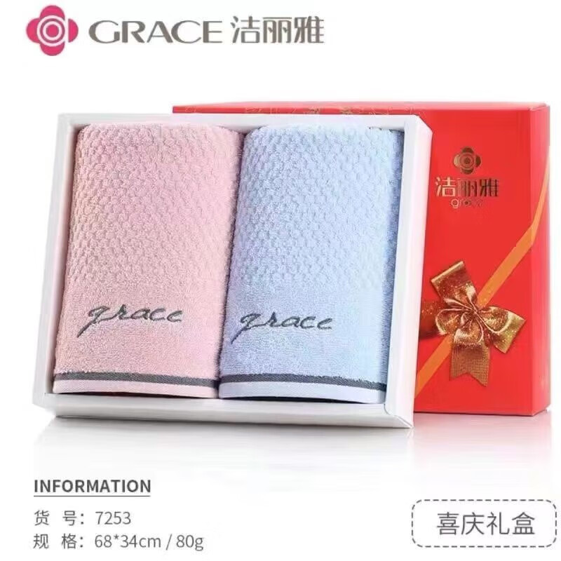 洁丽雅(Grace)毛巾礼盒2条装纯棉全棉毛巾婚庆回礼商务公司团购生日伴手礼批发 7253粉+兰喜庆礼盒+手提袋 全棉