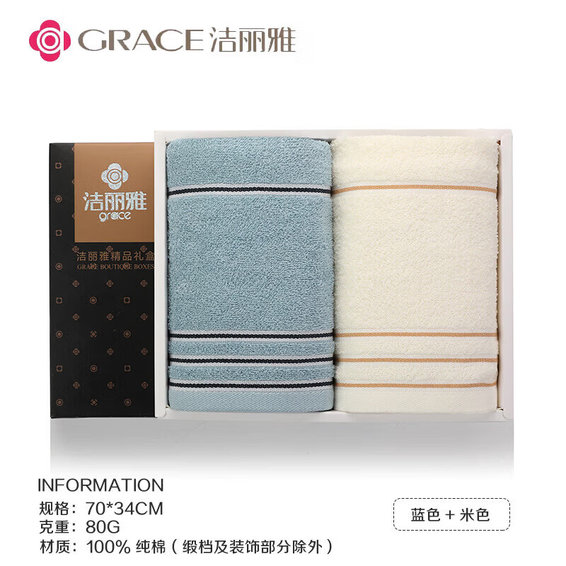 洁丽雅(Grace)毛巾礼盒2条装纯棉全棉毛巾婚庆回礼商务公司团购生日伴手礼批发 7377蓝+米商务礼盒+手提袋 2条 全棉