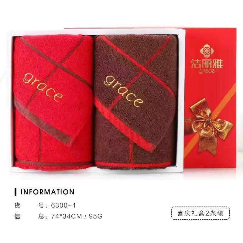 洁丽雅(Grace)毛巾礼盒2条装纯棉全棉毛巾婚庆回礼商务公司团购生日伴手礼批发 6300红+棕喜庆礼盒+手提袋 全棉