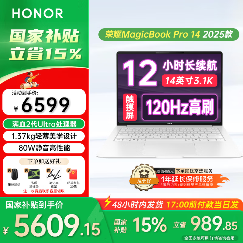 荣耀MagicBook Pro14【补贴15%】 AI笔记本92Wh巨量电池 绿洲护眼OLED超清大屏全能办公大学生电脑 U5-225H 32G+1T固态【月光白】触摸屏