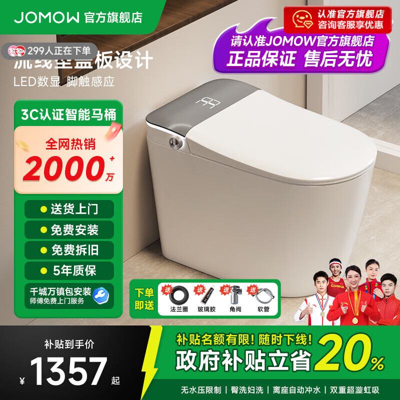 JOMOW智能马桶一体机无水压限制自动翻盖语音泡沫盾香薰轻音冲水坐便器 863标配【手动翻盖+脚感冲水】 250/300/350/400mm 下单请备注