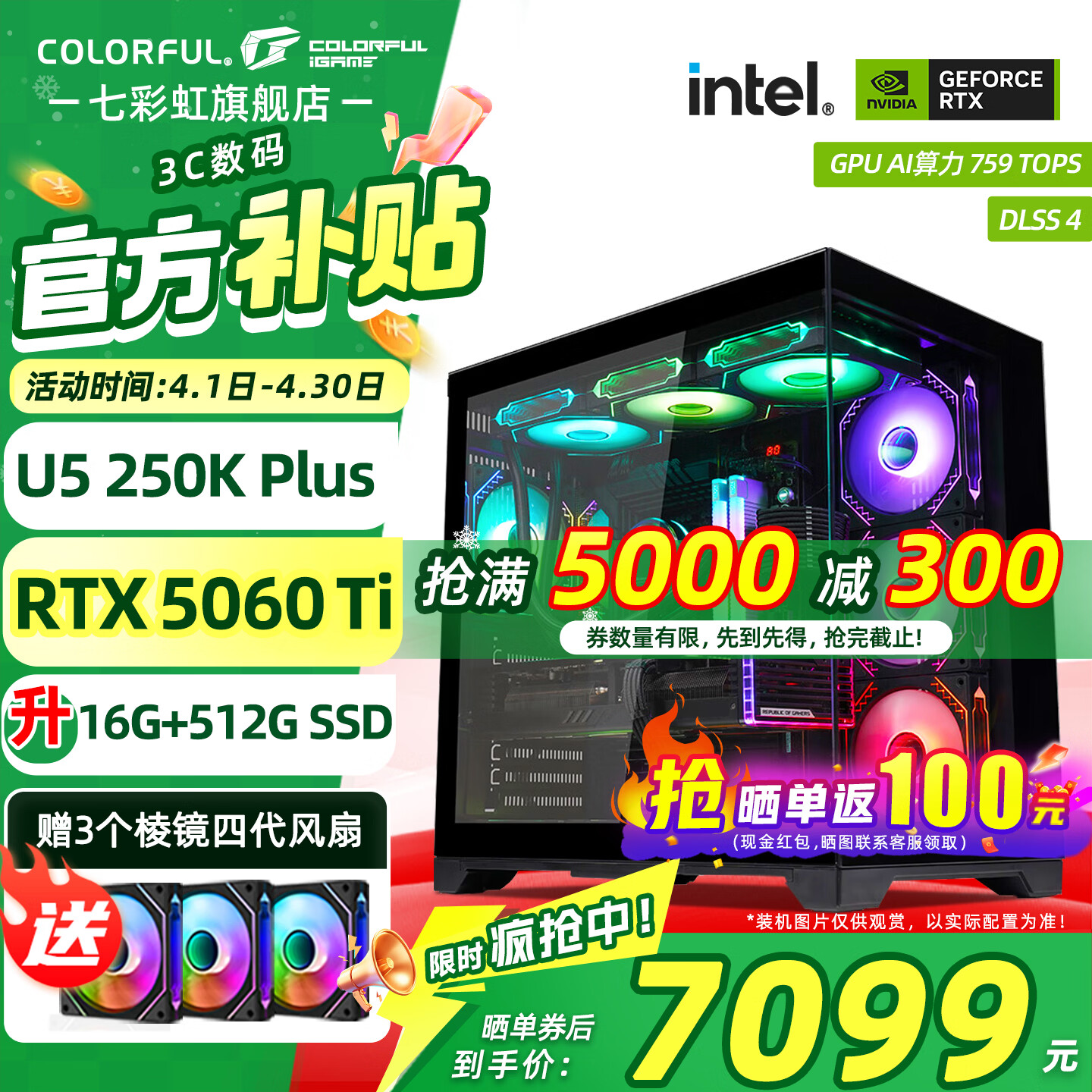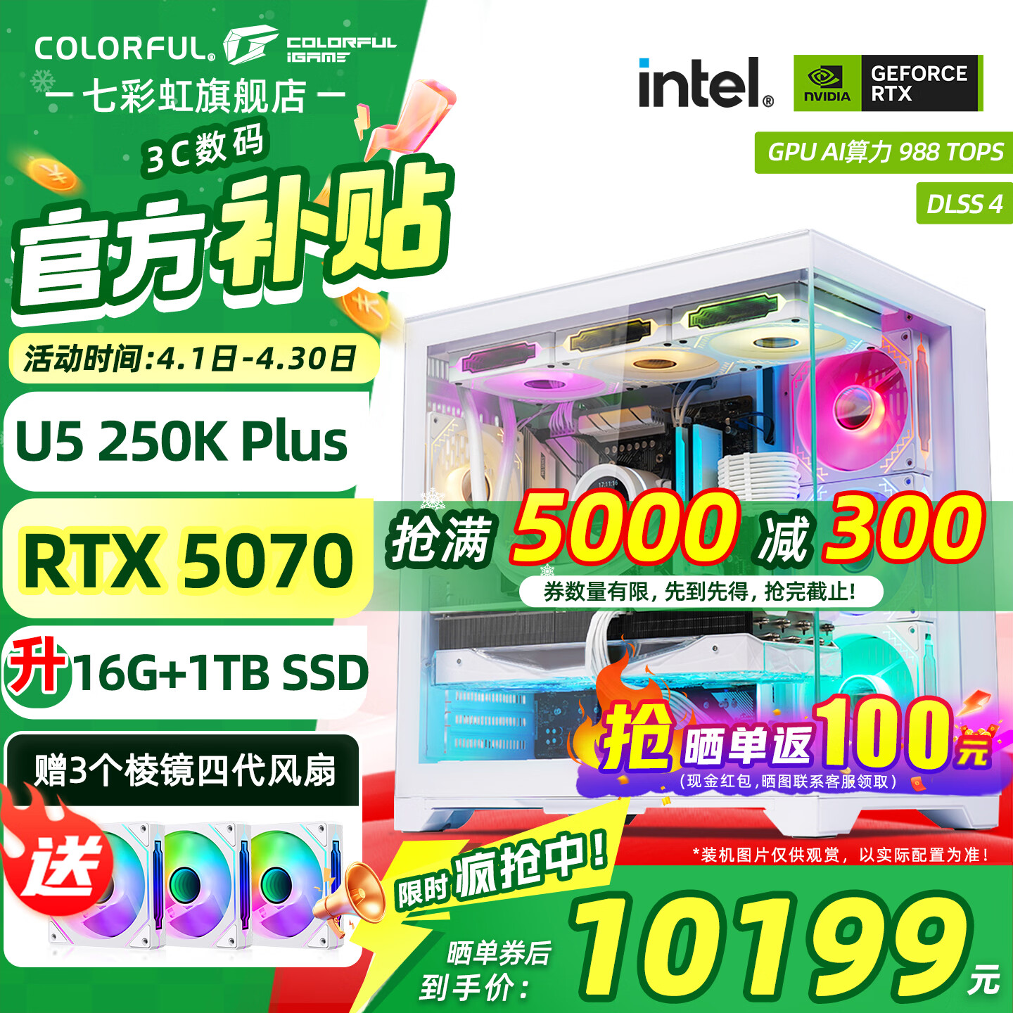 七彩虹(Colorful)酷睿15代U7 265KF RTX5060TI/5070TI/5080 5090D显卡 电竞游戏 龙虾AI设计台式电脑组装机 新品配一:U5 250K丨1TB丨5070 官方全新保障