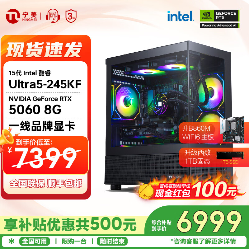 宁美 龙魂14代i5 14600KF/RTX5060Ti电竞3A游戏台式电脑海景房主机DIY组装电脑 U5-245KF+5060|配置六 全系精选高规用料