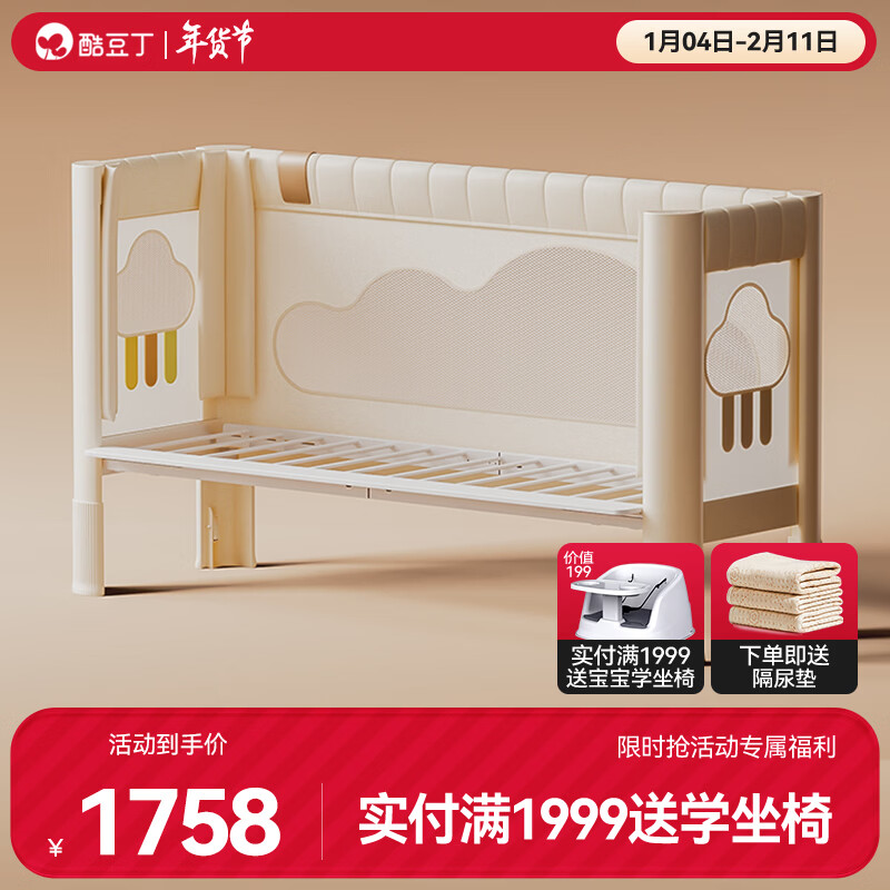 酷豆丁云绵拼接床婴儿床可折叠拼接床大人可睡无缝连接可调节加宽高护栏 床+延长板+防撞条 尺寸:200x65cm