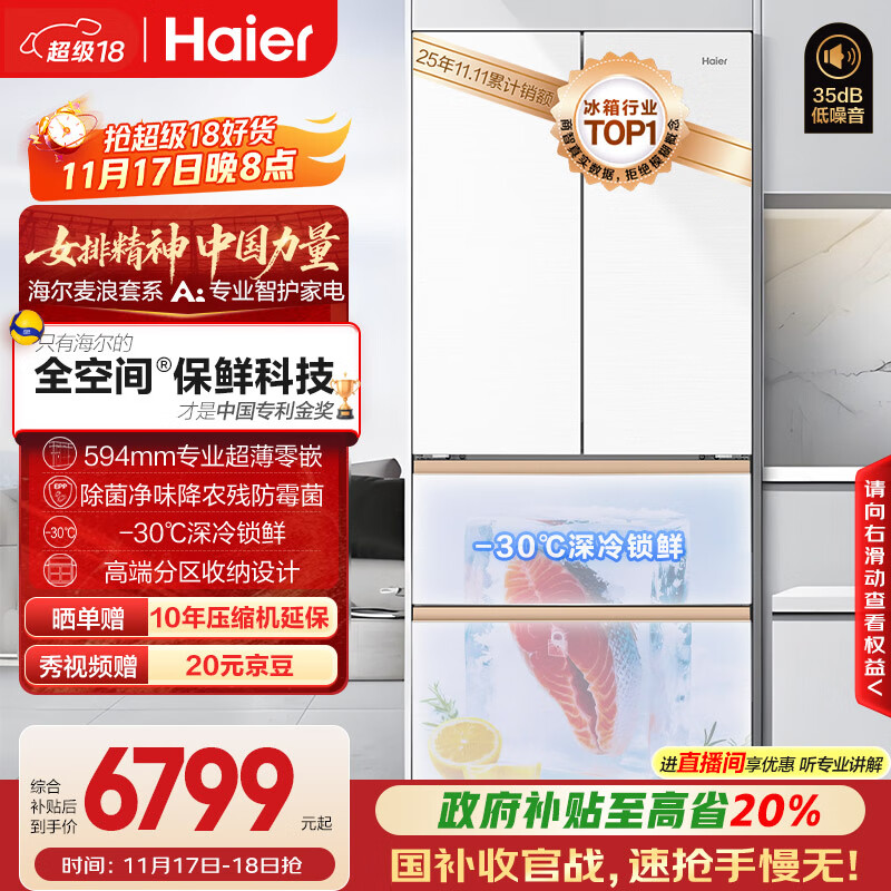 海尔(Haier)「麦浪套系」511升全空间保鲜超薄零嵌法式多门家用电冰箱BCD-511WGHFD1BWLU1国家补贴20%