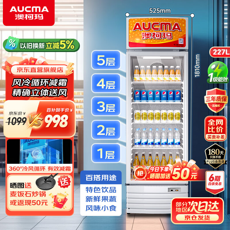 澳柯玛(AUCMA)237大容量立式单门商用冷藏展示柜 超市饮料啤酒保鲜冷柜 陈列冰柜冰箱 风冷循环一级能效 SC-237