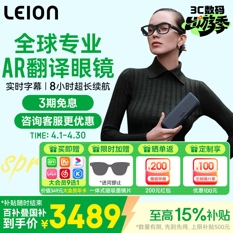 LEION HEY2亮亮视野智能ai翻译眼镜ar演讲提词实时专业翻译机同声传译蓝牙字幕听障助听器长续航听语者