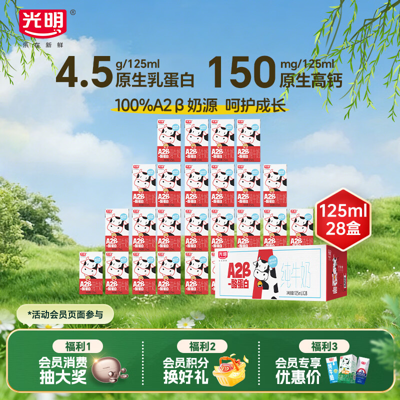 光明A2β-酪蛋白纯牛奶125ml*28盒 4.5g乳蛋白 学生早餐奶礼盒装整箱