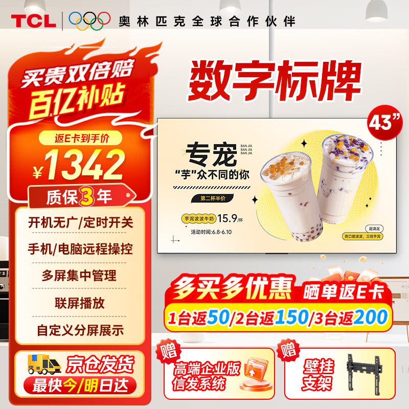 TCL门店电视43英寸数字标牌一体机可吊挂壁挂信息发布广告屏电视机电子菜单奶茶餐饮显示器PID43P20M