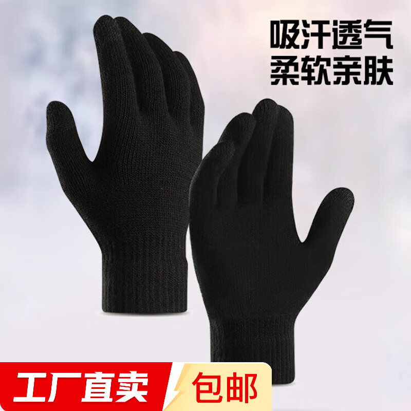 男女秋冬纯色针织手套保暖加绒弹力毛线分指学生户外骑行防寒手套 黑色 均码 1双