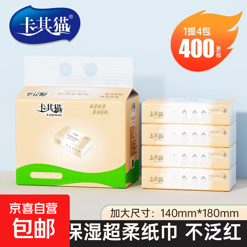 卡其猫乳霜纸国民品牌保湿抽纸超润超值敏感必备云柔巾 3层100抽 卡其猫 3层 100抽*4包
