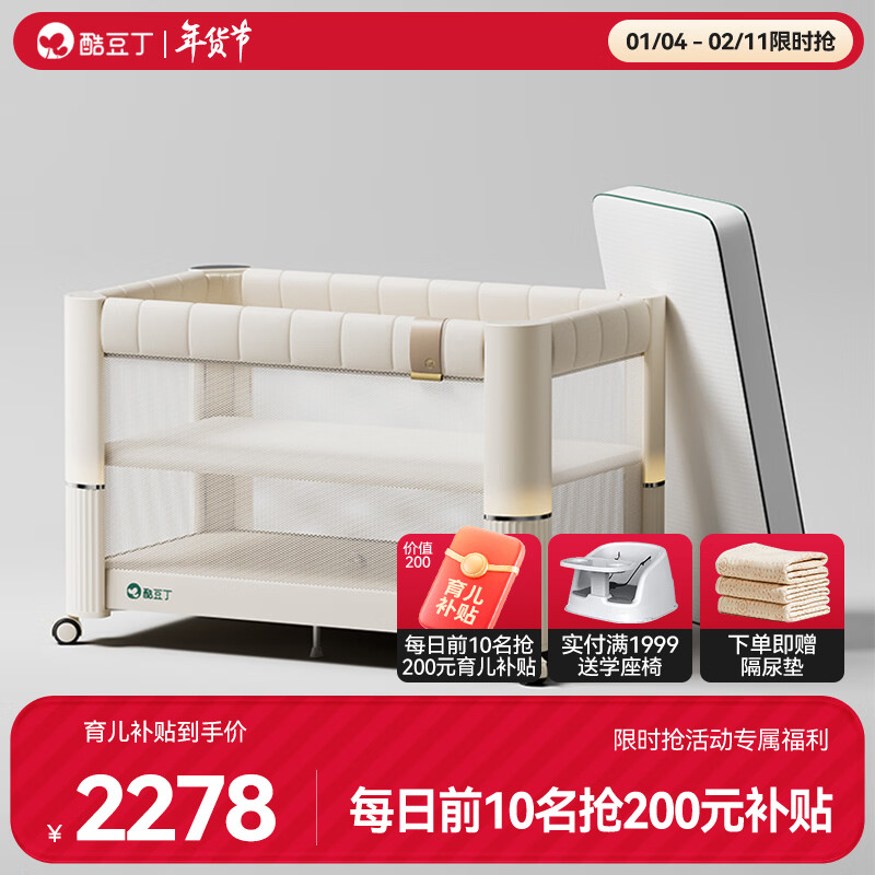 酷豆丁云朵智能哄睡多功能婴儿床可折叠可移动拼接床新生婴儿床 云朵床+4D纤维床垫