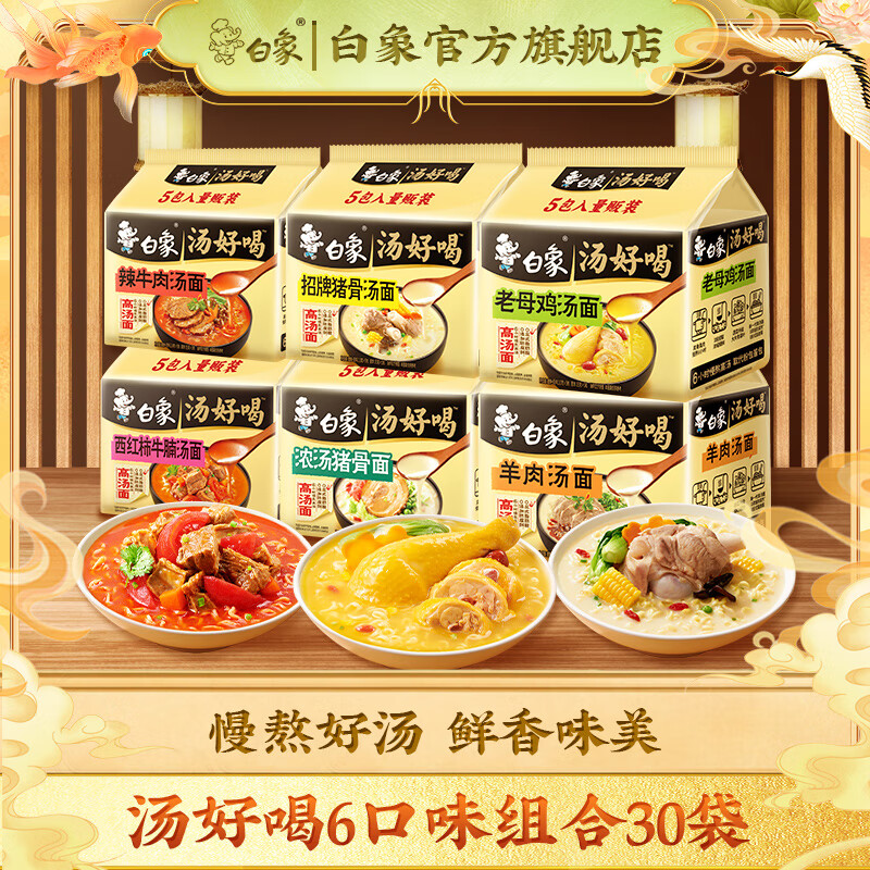 白象 汤好喝方便面老母鸡汤招牌猪骨泡面组合方便速食多口味袋装整箱 鸡/猪/牛/羊/豚骨/牛腩30袋3338g