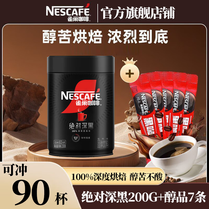 雀巢(Nestle)咖啡醇品深黑燃魂美式无糖低脂速溶纯黑咖啡粉办公健身 90杯】深黑200g+醇品1.8g*7[26.1产]