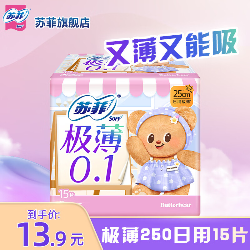苏菲卫生巾黄油小熊夜用超熟睡420mm柔棉感超长整箱组合装姨妈巾 极薄0.1日用250mm15片