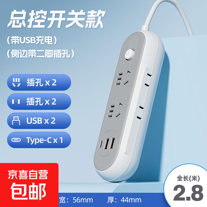 【京东物流】家用插座正品带usb插排插线板多功能排插接线板插板带线大功率 高贵灰-10孔2USB 2.8米【带边插款】