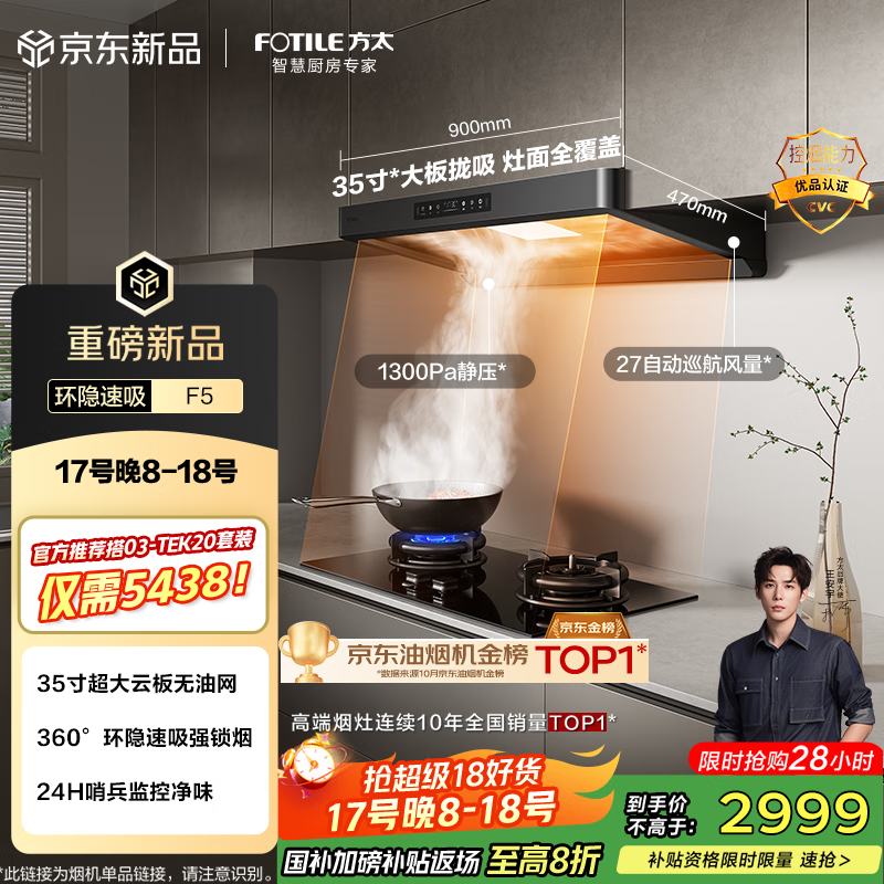 方太(FOTILE)F5纤薄欧式顶吸抽吸油烟机家用厨房 27风量无油网【官方推荐搭03-TEK20】以旧换新国家补贴20%