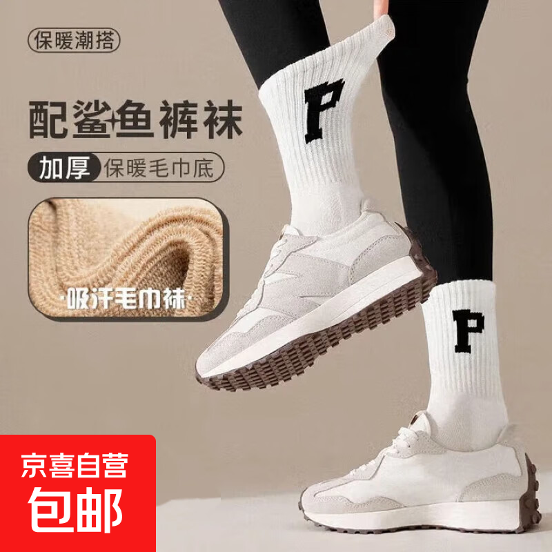 袜子女款冬季加绒加厚保暖毛圈袜字母潮袜外穿中筒袜毛巾底长袜子 颜色随机 2双 均码