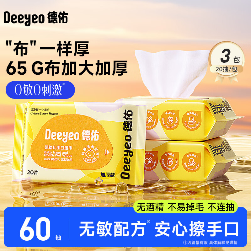 德佑湿巾保湿擦脸巾出行便携卸妆洁面巾柔软亲肤不掉絮化妆湿巾 厚款 20抽 3包【卸妆便携】
