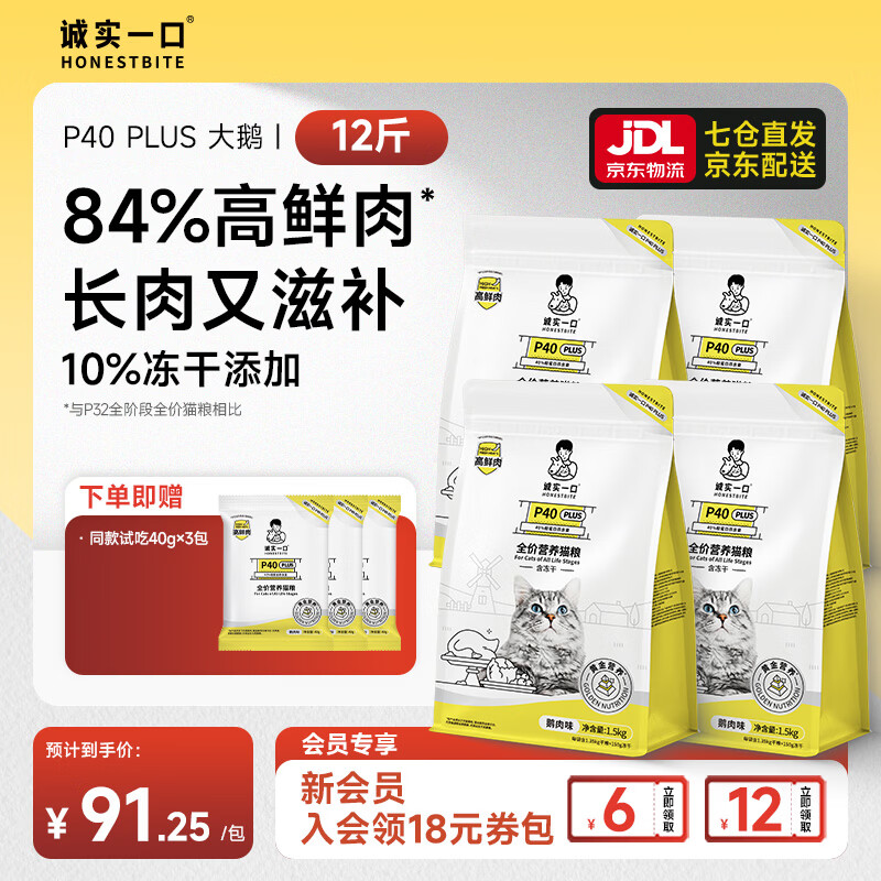 诚实一口P40 PLUS冻干猫粮成猫幼猫≥80%鲜肉长肉养胃多口味通用型 84%高鲜肉 10%冻干丨大鹅6kg