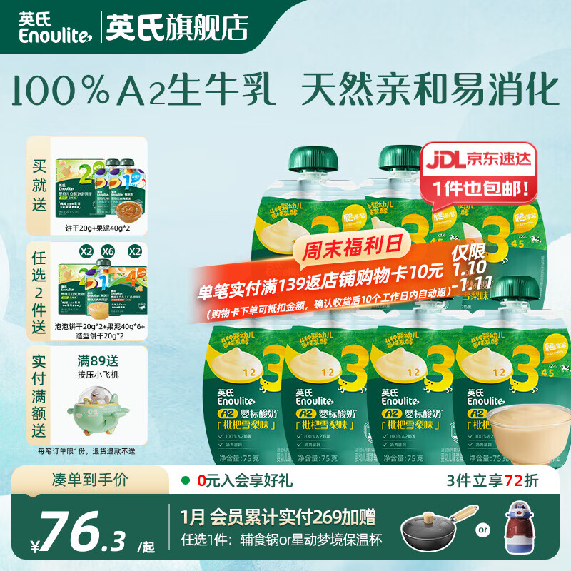 英氏畅润多果泥辅食泥 酸奶 整箱礼盒装(适用于6个月以上宝宝) 【一周囤货组】3阶A2婴标酸奶 枇杷雪梨味 75g*7袋