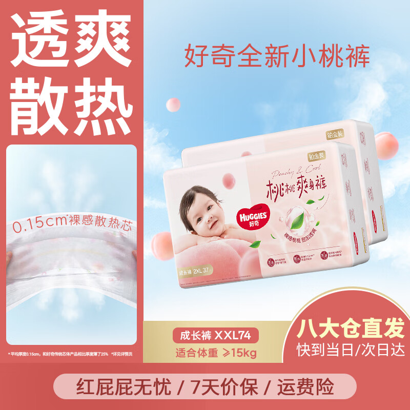 好奇(Huggies)铂金装成长裤婴儿拉拉裤小桃裤夏日超薄透气 XXL74片(15kg以上)