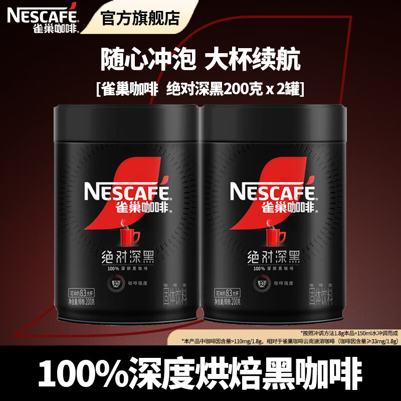 雀巢(Nestle)咖啡醇品深黑燃魂美式无糖低脂速溶纯黑咖啡粉办公健身 绝对深黑200g*2罐