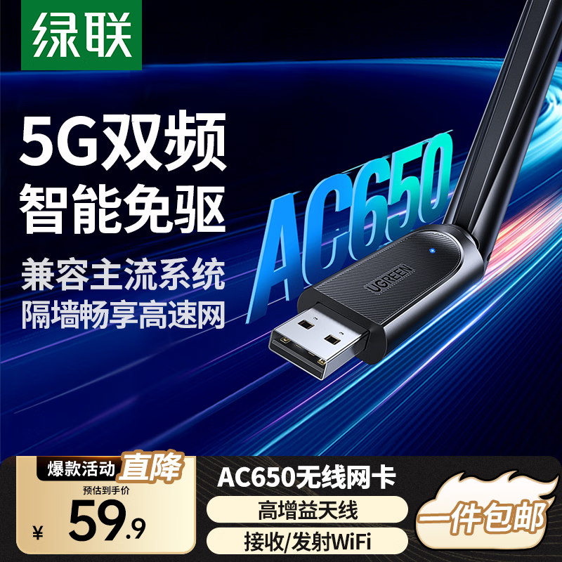 绿联 WiFi6免驱 USB无线网卡台式机专用 无线WiFi接收器5G双频 台式笔记本电脑WiFi接收器发射器 【AC650-WiFi5】5G双频 高增益天线