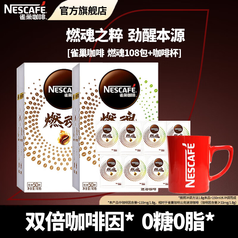 雀巢(Nestle)咖啡醇品深黑燃魂美式无糖低脂速溶纯黑咖啡粉办公健身 【含咖啡杯】燃魂黑咖108包