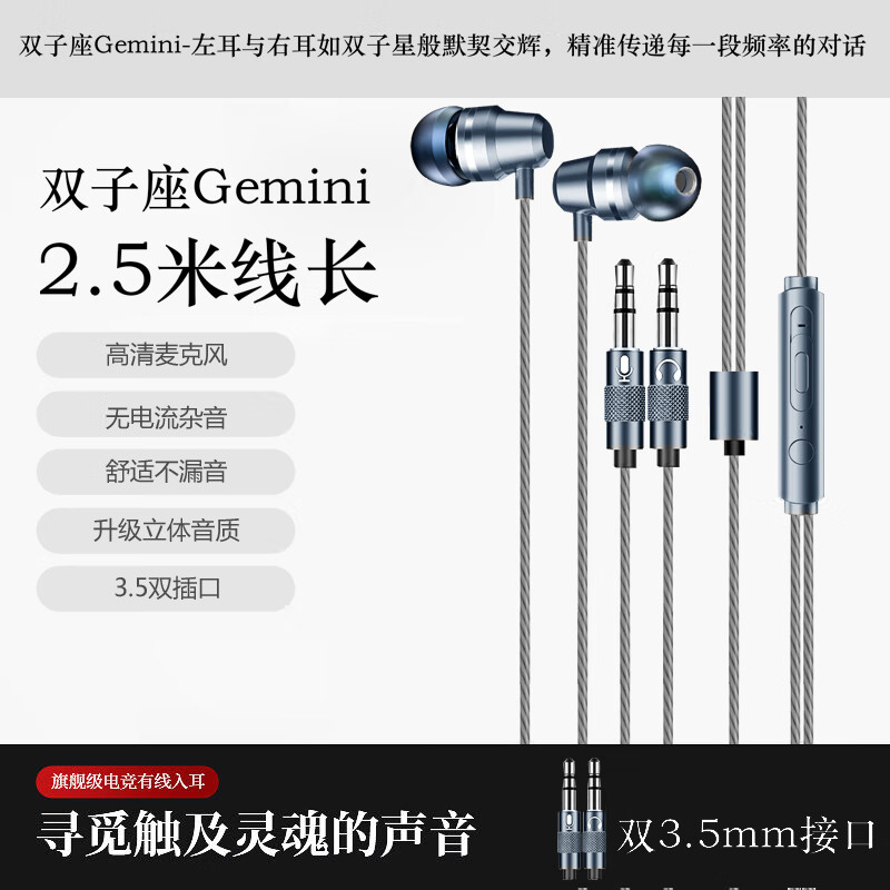 品士【3米加长线】电脑耳机有线入耳式带麦克风二合一台式机笔记本游戏耳麦电竞直播双孔插头圆头专用 2.5米语音通话【银色】双插头