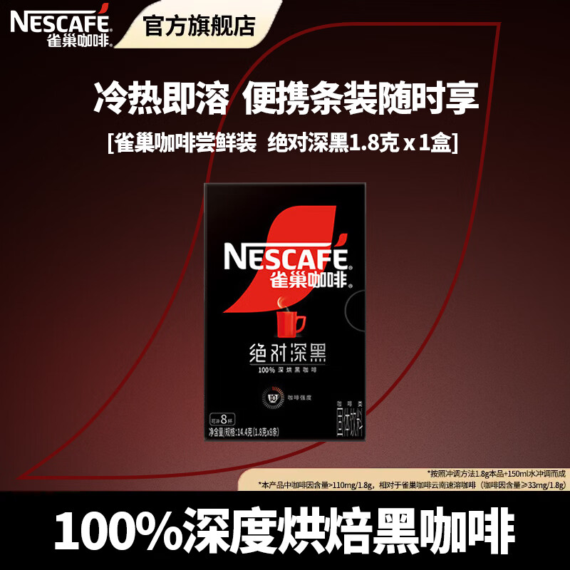 雀巢(Nestle)咖啡醇品深黑燃魂美式无糖低脂速溶纯黑咖啡粉办公健身 绝对深黑1.8g*8条/盒
