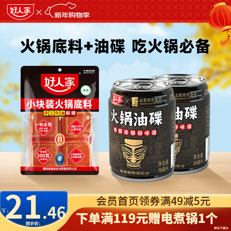好人家0添加香辣牛油火锅底料煮火锅冒菜麻辣烫小块分装露营便携调料 【火锅CP】麻辣200g+香油70ml*2