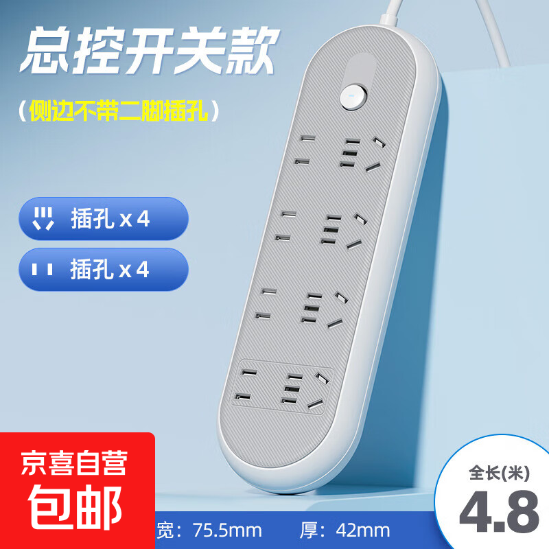 【京东物流】家用插座正品带usb插排插线板多功能排插接线板插板带线大功率 高贵灰-28孔 4.8米【普通款】