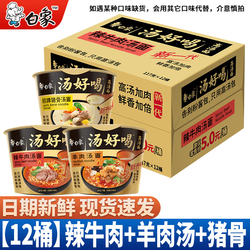 白象方便面汤好喝桶面桶装整箱7口味混搭速食泡面批发免煮速食 【12桶整箱】辣牛肉+羊肉汤+猪骨