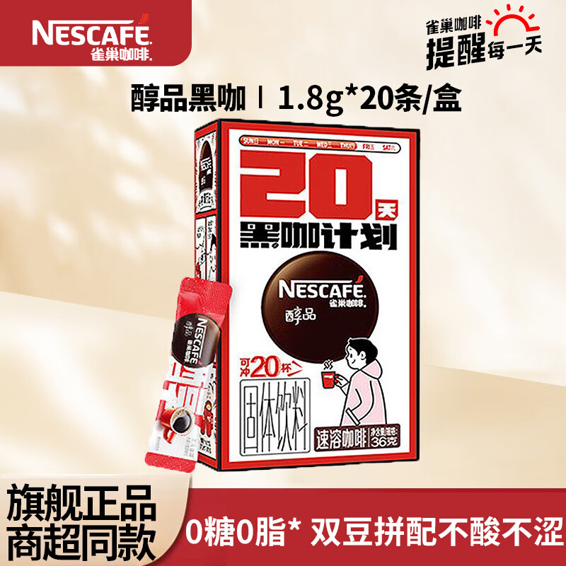 雀巢(Nestle)咖啡醇品深黑燃魂美式无糖低脂速溶纯黑咖啡粉办公健身 醇品黑咖1.8g*20条/盒