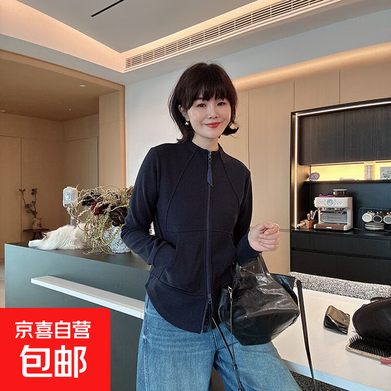 修身立领拉链短外套女2025秋季大码胖MM显瘦百搭休闲长袖洋气上衣 黑色 L 建议85-105斤