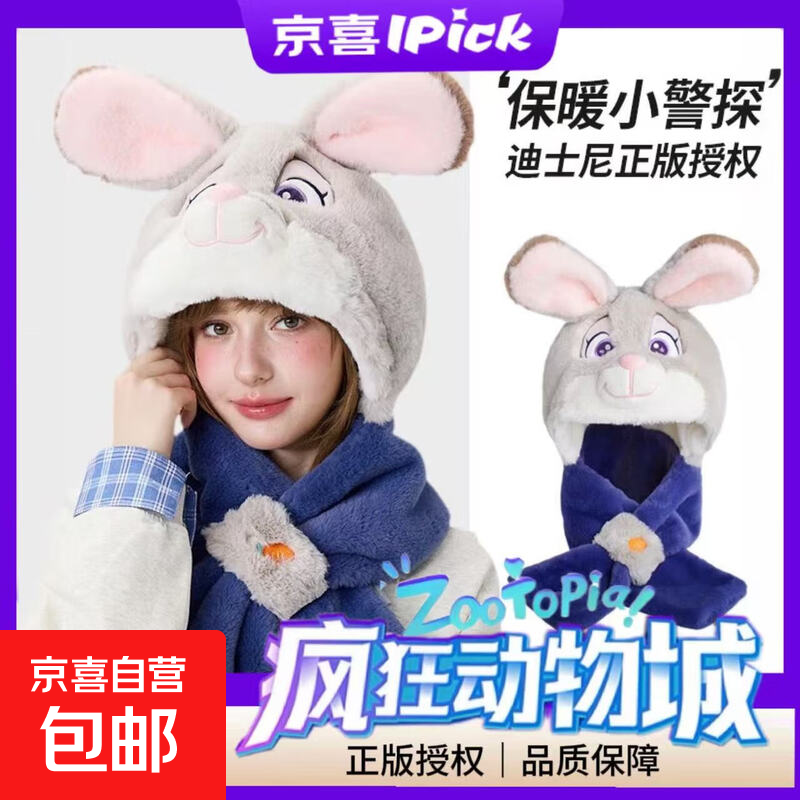 疯狂动物城帽子冬季保暖围巾一体朱迪卡通毛绒俩件套女可爱护耳帽 立体朱迪俩件套-灰蓝