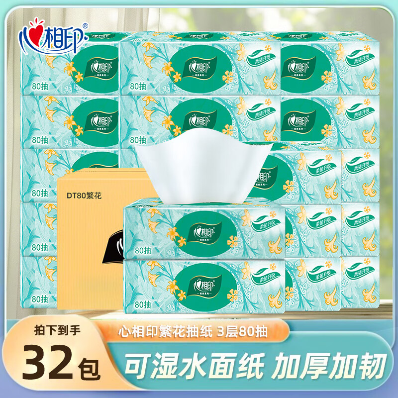 心相印抽纸繁花系列家用实惠装超市同款擦手纸巾餐巾纸厚实亲肤 3层 80抽*32包 整箱装
