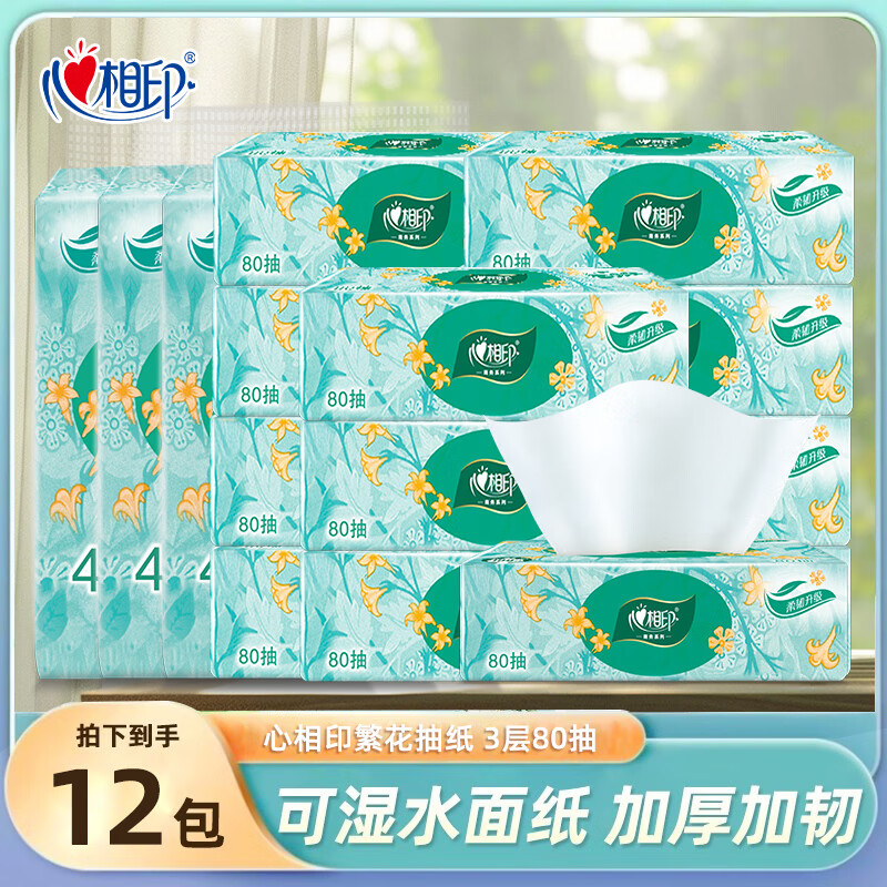 心相印抽纸繁花系列家用实惠装超市同款擦手纸巾餐巾纸厚实亲肤 3层 80抽*12包