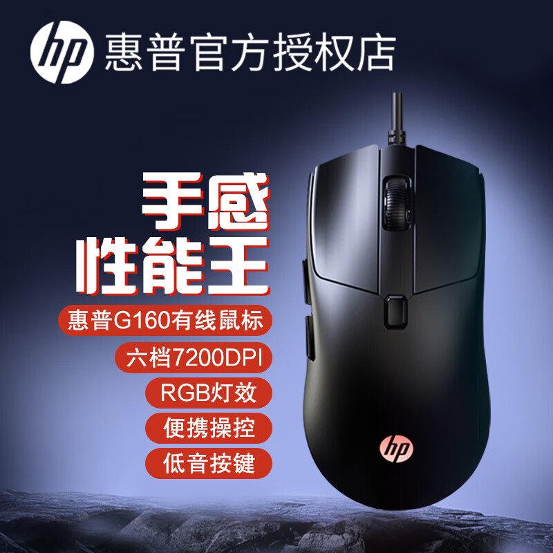 惠普(HP) 有线鼠标 商务办公家用经典左右手通用对称鼠标有线 电脑笔记本USB接口即插即用 黑色轻音-6键宏编程