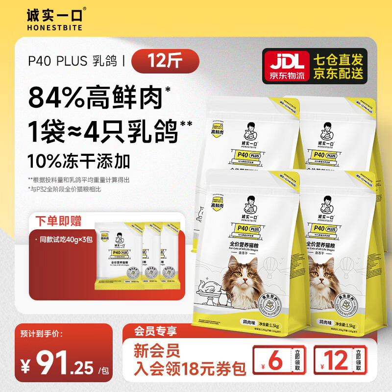 诚实一口P40 PLUS冻干猫粮成猫幼猫≥80%鲜肉长肉养胃多口味通用型 1袋≈4鸽 10%冻干丨乳鸽6kg