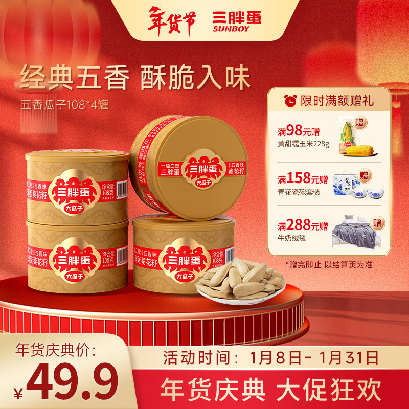 三胖蛋五香葵瓜子罐装大颗粒休闲零食坚果炒货葵花籽108g 五香葵瓜子【罐装】108g*4